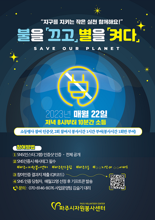 [금요저널] 파주시 자원봉사센터에서는 3월 22일을 시작으로 매달 22일 파주시 전역에서 저녁 8시부터 10분간 ‘불을 끄고 별을 켜다’라는 소등 자원봉사를 추진한다고 밝혔다.