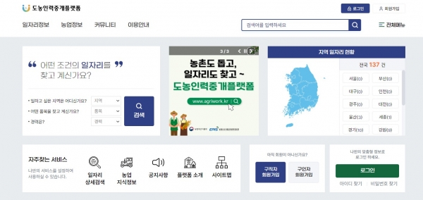 [금요저널] 농촌 인구감소·고령화로 농업 고용인력의 외국인력 의존도가 높아지고 매년 인력수요가 집중되는 농번기 등 인력난 발생에 따라, 농림축산식품부에서는 농작업 참여를 희망하는 구직자와 구인 농가를 연결할 수 있는 농업 분야에 특화된 일자리 정보·서비스를 통합 제공하는‘도농인력중개플랫폼 ’을 구축하고 운영 중에 있다.
