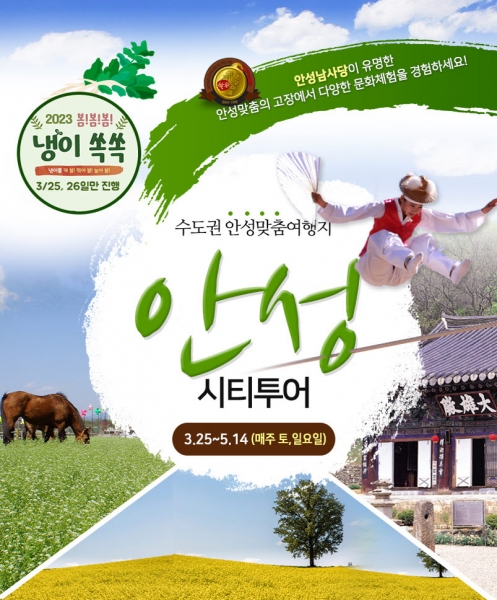 매주 토·일요일 운영되는 안성시티투어의 주요 코스는 안성의 옛 모습을 경험할 수 있는 안성맞춤박물관과 청룡사를 비롯해 ‘한국관광 100선’에 선정된 안성팜랜드 등이며 봄나물 캐기, 떡케이크 만들기 등 농촌테마마을의 계절별 다양한 체험과 함께 자연을 느낄 수 있는 프로그램들이 풍성하다.