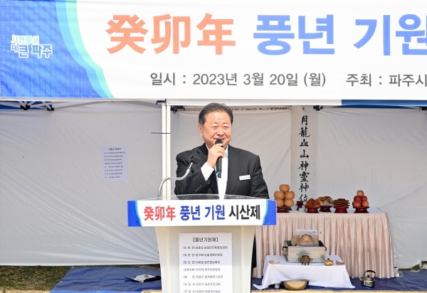김경일 파주시장은 격려사를 통해 “3년 만에 정상 개최하는 시산제를 축하드린다”며 “농업발전을 위해 애쓰시는 모든 농업인들에게 감사드리며 올 한 해 풍년 농사가 이뤄지길 간절히 바란다”고 말했다.