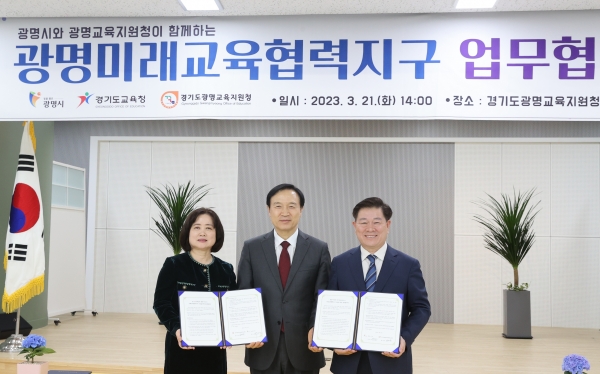 [금요저널] 광명시는 21일 광명교육지원청에서 경기도교육청과 미래교육협력지구 업무협약을 맺고 광명교육지원청과 2023년 광명미래교육협력지구 세부 사업을 확정하는 부속 합의를 체결했다.