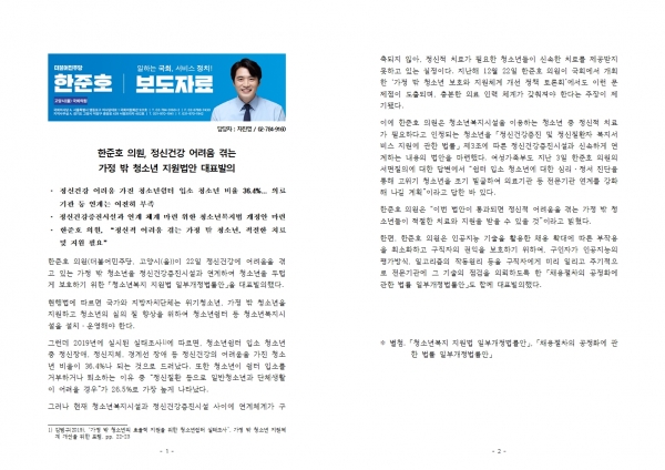 한준호 의원은 “이번 법안이 통과되면 정신적 어려움을 겪는 가정 밖 청소년들이 적절한 치료와 지원을 받을 수 있을 것”이라고 밝혔다.