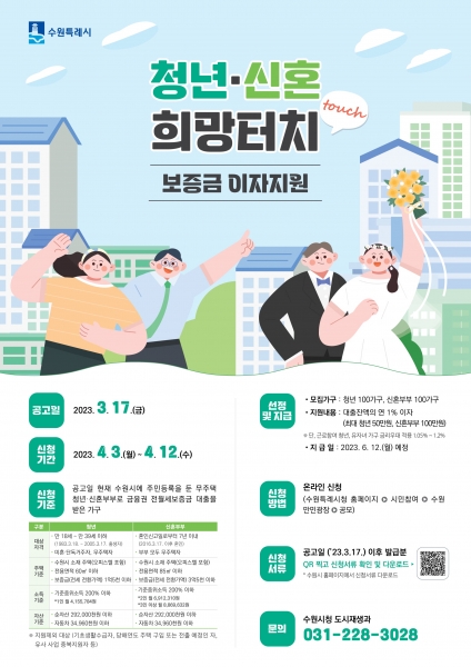 ‘청년·신혼 희망터치 보증금 이자지원’은 수원시에 주민등록을 둔 무주택자 중 금융권에서 전월세보증금 대출을 받은 만 18~39세 청년, 혼인신고일로부터 7년 이내인 부부에게 대출잔액의 1% 이자를 지원하는 사업이다.