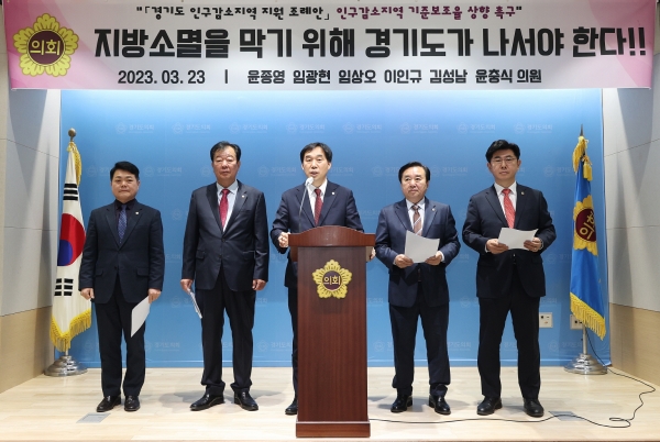 [금요저널] 경기도의회 윤종영, 임광현, 임상오, 이인규, 김성남, 윤충식 의원은 23일 경기도의회 브리핑룸에서 ‘경기도 인구감소지역 지원 조례안’의 인구감소지역 기준보조율 상향을 촉구하는 기자회견을 개최했다.