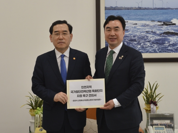 [금요저널] 윤관석 국회 산업통상자원중소벤처기업위원장은 23일 오전 이창양 산업통상자원부 장관에게 ‘인천지역 국가첨단전략산업 특화단지 지정 촉구 건의서’를 전달했다.