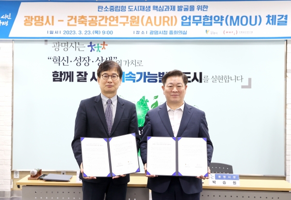[금요저널] 광명시는 23일 시청 중회의실에서 광명시 탄소중립형 도시재생사업 추진과 상호 협력을 위해 건축공간연구원과 업무협약을 체결했다.