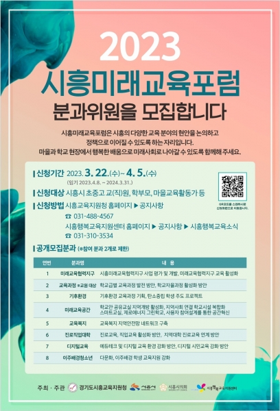 [금요저널] 시흥시와 경기도시흥교육지원청, 시흥시의회는 민관학 지역교육협의체인 ‘2023 시흥미래교육포럼’ 구성을 위한 분과위원을 3월 22일부터 4월 5일까지 공개 모집한다.