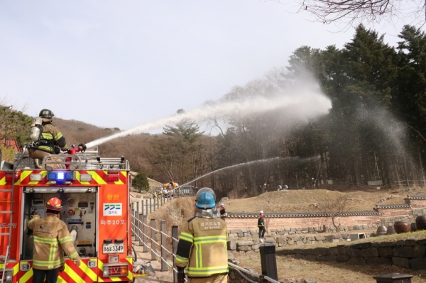 [금요저널] 파주소방서는 지난 23일 파주시 광탄면 소재 고령산 보광사에서 산불화재 대응강화 합동 현지적응훈련을 실시했다.