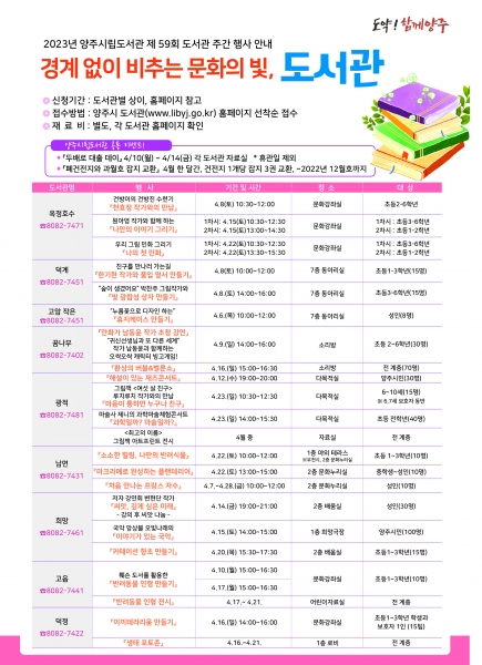 [금요저널] 양주시도서관은 2023년 제59회 도서관 주간을 맞아 ‘경계 없이 비추는 문화의 빛’이라는 주제로 작가 초청, 공연, 체험행사, 전시 등 다채로운 독서 문화행사를 4월 한 달간 운영한다.