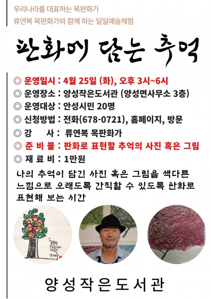 본 프로그램은 4월 25일 화요일 오후 3시부터 6시 사이에 양성작은도서관에서 원데이 클래스로 진행될 예정이다.