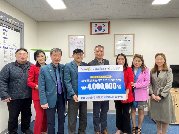이날 퇴계원로타리클럽은 ‘원기 회복 프로젝트’ 협약식과 더불어 지역 내 저소득층 40가구에 시장이나 마트, 음식점 등에서 쓸 수 있는 10만원 상당의 기프트 카드를 전달했다.
