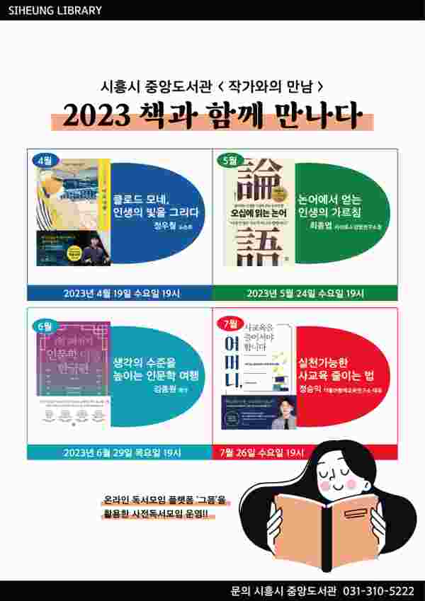 4월 19일 ‘도슨트 정우철의 미술극장’ 정우철 저자의‘클로드 모네, 인생의 빛을 그리다’ 5월 24일 ‘오십에 읽는 논어’ 최종엽 저자의‘논어에서 얻는 인생의 가르침’ 6월 29일 ‘1일 1페이지 인문학 여행 한국편’ 김종원 저자의‘생각의 수준을 높이는 인문학 여행’ 7월 26일 ‘어머니, 사교육을 줄이셔야 한다’ 정승익 저자의‘실천 가능한 사교육 줄이는 방법’으로 매월 19시 중앙도서관 다목적실에서 운영한다.