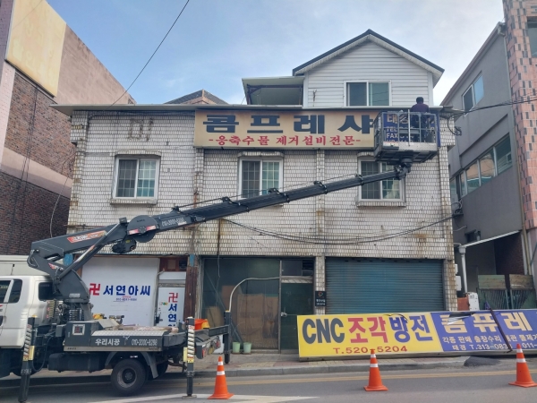 이번 ‘주인 없는 간판’ 정비사업은 여름철 풍수해로 안전사고가 우려되는 노후 간판 및 노영업장 폐업, 이전 및 관리자 부재 등으로 장기간 방치된 사업장의 간판에 사고를 사전에 예방하고자, 행정부가 주관해 정비하는 사업이다.
