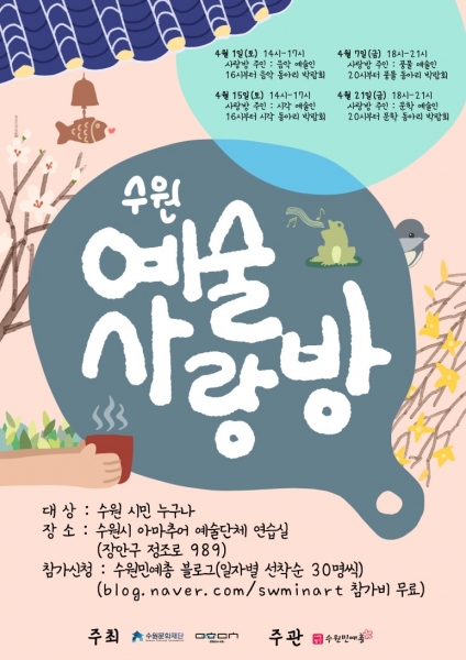 [금요저널] 수원문화재단 문화도시센터는 오는 4월 1일 토요일부터 4월 한 달간 총 4회에 걸쳐 수원시 아마추어 예술단체 연습실에서‘수원예술사랑방’을 개최한다.