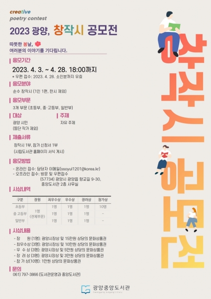 오는 4월 3일부터 28일까지 열리는‘2023 창작시 공모전’은 무한한 가능성을 가진 새로운 예비 작가를 발굴하고 광양시민의 창작 욕구를 지원하기 위해 마련됐다.