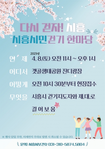 [금요저널] 시흥시보건소 건강도시과는 코로나19 방역 해제에 따른 일상 회복에 발맞춰 지역주민의 건강 증진을 도모하고자 오는 4월 8일 갯골생태공원 잔디광장에서 ‘다시 걷자 시흥 시흥시민 걷기한마당’을 개최한다.