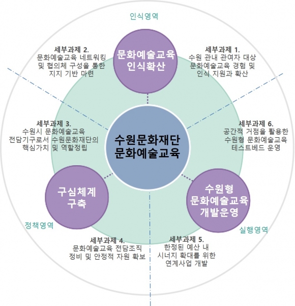 연구결과, 수원시 문화예술교육 발전을 위해서 문화예술교육 인식확산 문화예술교육 구심 체계 구축 수원형 문화예술교육 개발운영의 3대 당면과제와 6개의 세부과제가 도출됐다.