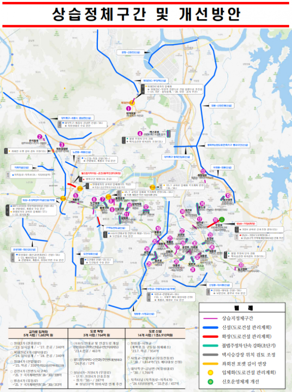 이 가운데 원도심 지역인 계룡로 등 16개 구간은 불법주정차 단속, 신호체계 개선, 좌회전 포켓 길이 조정 등 도로운영 개선을 통한 단기 개선과제로 확정하고 신속하게 추진할 계획이라고 전했다.