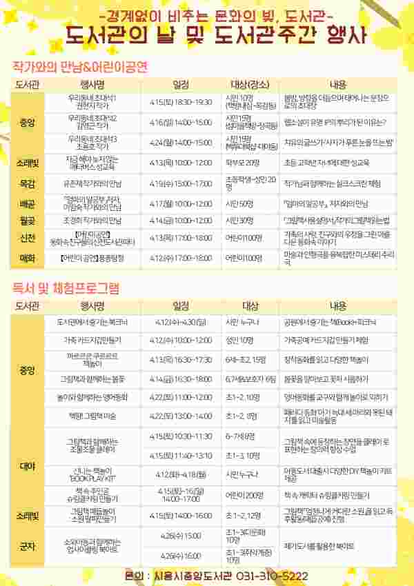 이 외에도 독후 체험 프로그램으로 중앙도서관 ‘도서관에서 즐기는 북크닉’ 등 6강 대야도서관 ‘그림책과 함께하는 조물조물 클레이’ 등 4강 소래빛도서관 ‘그림책 매듭놀이: 나만의 소원 팔찌만들기’ 군자도서관 ‘소외아동과 함께하는 업사이클링 북아트’ 정왕어린이도서관 ‘북스타트 책놀이터’ 등 3강 목감도서관 ‘사서의 서재’ 등 5강 장곡도서관 ‘그림책 놀이터’ 등 4강 배곧도서관 ‘나의 도서관 탐구생활’ 등 7강 월곶도서관 ‘1책 독파하기-물고기는 존재하지 않는다’ 등 3강 신천도서관 ‘전래놀이’ 등 3강이 도서관별로 마련돼 있다.