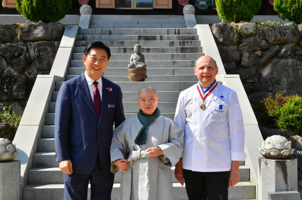 [금요저널] 프랑스 요리 전문학교 ‘르꼬르동블루’ 본교 학과장인 에릭 브리파와 관계자들이 29일 장성군 백양사 천진암을 방문했다.