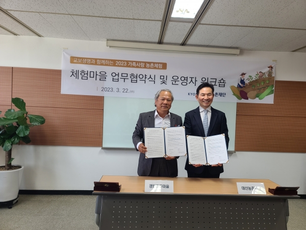 [금요저널] 농촌체험휴양마을로 운영되고 있는 신흥해바리와 갱번마루가 교보생명이 운영하는 대산농촌재단과 함께 ‘2023 가족사랑 농촌체험 프로그램’을 운영하기로 하고 최근 업무협약을 체결했다.