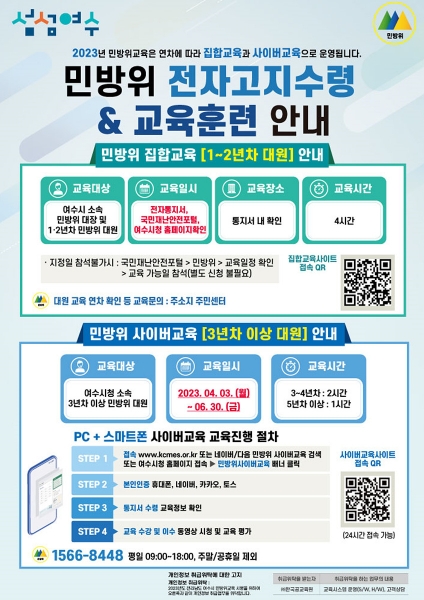 교육방법은 여수시청 홈페이지에 있는 배너 QR스캔 또는 포털사이트 검색으로 ‘민방위사이버교육’에 접속해 본인인증 후 진행할 수 있다.