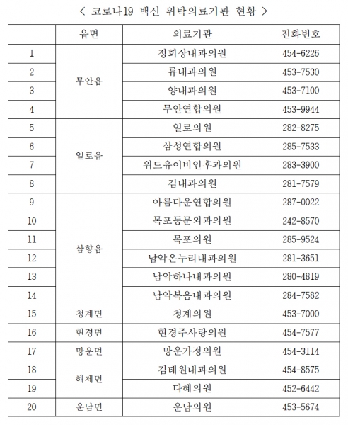 [금요저널] 전남 무안군은 2가 백신을 활용한 코로나19 동절기의 추가접종을 4월 8일 자정부터 종료함에 따라 접종 위탁의료기관을 33개소에서 20개소로 축소 운영한다.