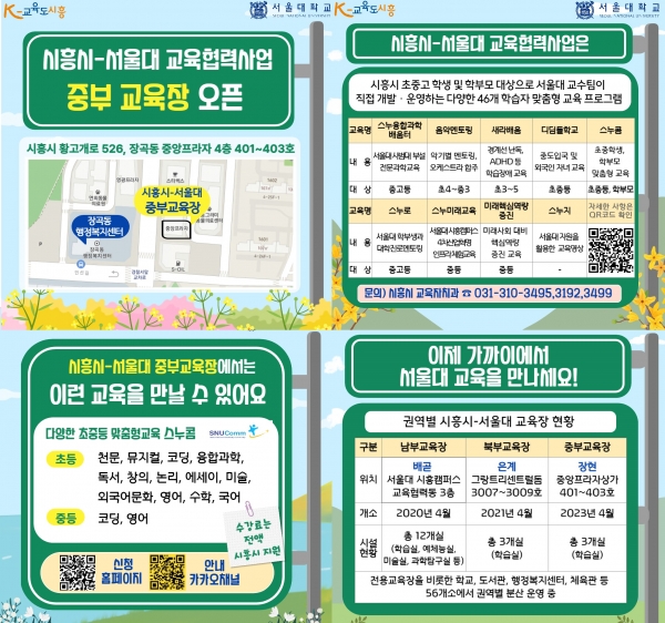 시흥시는 민선 8기 ‘K-교육도시 시흥’완성을 공약으로 내걸고 서울대학교 시흥캠퍼스 조성과 더불어, 2010년부터 추진해온 서울대 교육협력사업을 시흥시에서만 누릴 수 있는 ‘교육도시 시흥’의 대표 브랜드로 내세우고 있다.