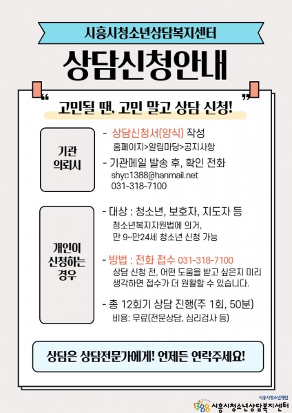 한편 시흥시청소년상담복지센터는 문자, 전화, 페이스북, 카카오톡 등으로 상담이 가능한 1388 청소년 상담을 적극 홍보하며 청소년전화 1388 운영, 각종 심리검사, 청소년들의 개인 및 집단상담, 학교폭력예방교육 등을 통해 안전하고 건강한 사회구성원으로 성장할 수 있도록 다방면으로 노력하고 있다.