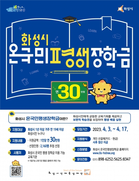 [금요저널] 화성시인재육성재단은 4월 3일부터 17일까지 ‘화성시 온국민평생장학금’ 이용자를 모집, 화성시민 2,160명에게 1인당 연 30만원을 지급한다고 밝혔다.