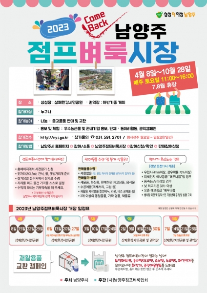 남양주점프벼룩시장은 시민들이 직접 참여해 의류, 잡화, 소형 가전 등 재활용이 가능한 물품들을 판매·교환하는 나눔 장터로 오는 4월 8일부터 10월 28일까지 연휴 및 7, 8월 혹서기를 제외한 매주 토요일마다 정기적으로 개최된다.