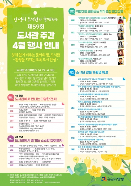 [금요저널] 안성시는 제59회 도서관주간을 맞이해 ‘환경’을 주제로 관내 5개 공공도서관에서 다양한 행사를 4월 한 달간 진행한다.
