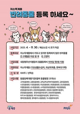 [금요저널] 파주시는 4월 3일부터 11월 30일까지 ‘장애인 및 저소득계층 반려동물 진료비 등 지원 사업’ 신청을 받는다고 밝혔다.