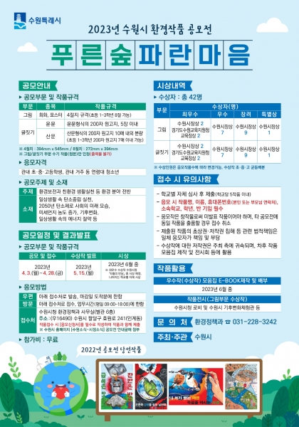 이를 수원시청 환경정책과로 방문·우편 제출하면, 수원시가 적합성, 전파성, 성실성, 표현력을 놓고 심사한다.