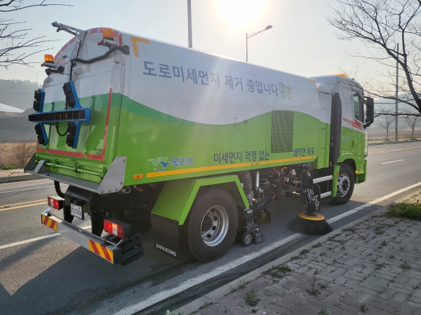 [금요저널] 목포시가 봄철 미세먼지 총력대응의 일환으로 도로 재 비산먼지를 제거하기 위해 노면청소차를 집중 운영하고 있다.