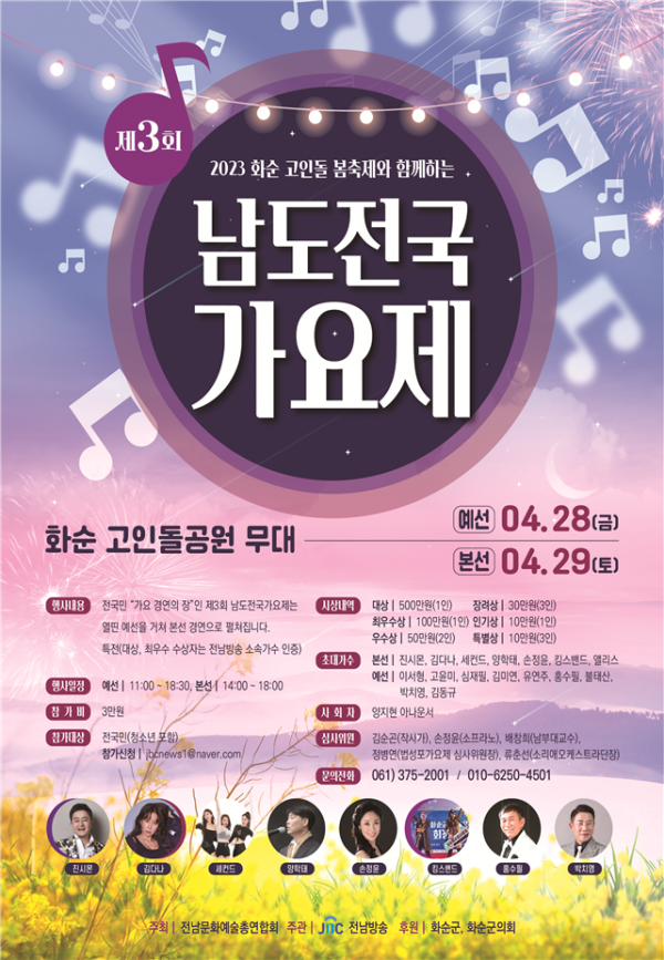 ‘남도전국가요제’는 화순 고인돌 축제 주무대에서 개최되며 4월 28일 예선이 치러지고 29일 본선에서 최종 우승자를 가리게 된다.