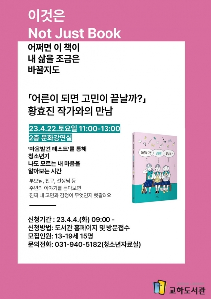 프로그램은 청소년이 자신의 마음을 발견하고 나아가 꿈을 발견하는 내용으로 강연하며 4월 22일 황효진 작가의 ‘어른이 되면 고민이 끝날까’ 4월 29일 백수연 작가의 ‘괜찮아, 꿈이 있으면 길을 잃지 않아’를 주제로 진행된다.