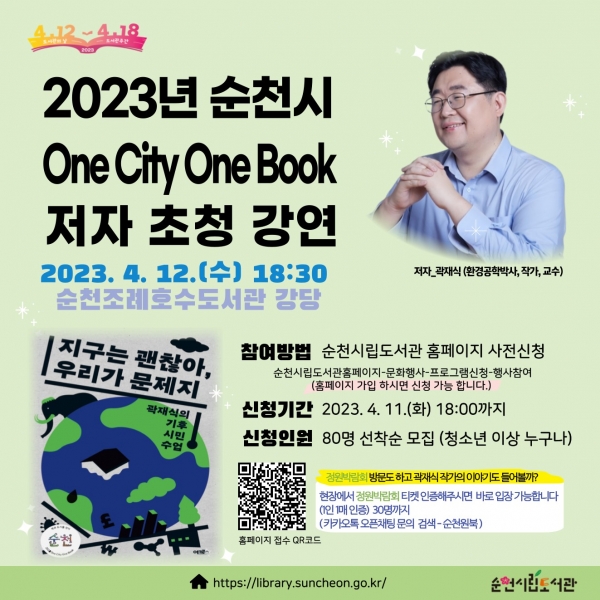 [금요저널] 순천시는 오는 12일 순천조례호수도서관 강당에서 2023년 One City One Book 선정도서인 ≪지구는 괜찮아, 우리가 문제지≫ 작가와의 만남을 진행한다.