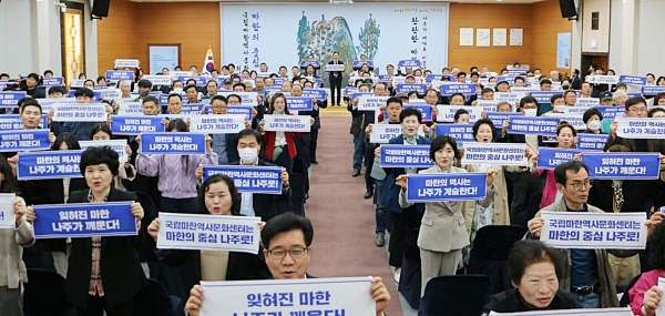 정홍채 반남마한유적보존회장은 결의문 발표를 통해 “어느 누구도 관심 없을 때 시민 스스로가 조직을 만들어 지난 50여년의 세월 동안 마한사 복원에 앞장서 왔던 나주가 센터 유치의 최적지”며 “마한의 후손 80만 나주인들은 마한의 역사문화를 창조적으로 계승·발전시킬 역사의 현장이자 마한의 중심 나주에 센터가 조성될 수 있도록 끝까지 함께하겠다”고 결의를 다졌다.