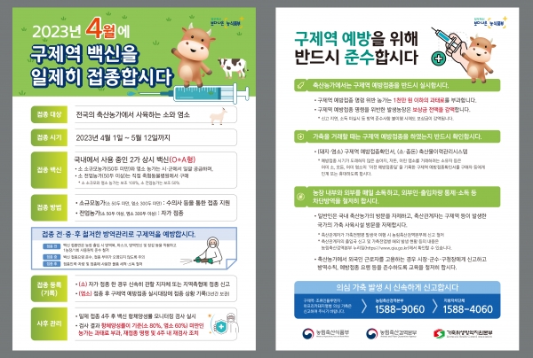 정대영 전남도 동물방역과장은 “구제역은 최근까지 중국 등 주변국에서 지속 발생하고 있어 도내 유입 방지를 위해선 백신 접종이 가장 강력한 차단방역”이라며 “모든 축산농가 및 관계기관에서는 일제접종 명령 고시, 백신 접종반 편성 등 사전 준비를 철저히 하고 일제접종 기간 한 마리도 빠짐없이 접종이 이뤄지도록 농가의 적극 협조 바란다”고 당부했다.