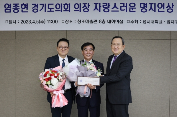 유 총장은 상패를 수여하며 “염종현 동문은 제8·9·10·11대 경기도의원을 역임하고 1,400만 도민을 대변하는 의장으로 선출되며 지역사회 발전에 이바지해 왔다”며 “후배들에게 훌륭한 본보기가 되는 자랑스러운 명지인으로서 앞으로도 우리 사회를 바르게 이끌어주길 바란다”고 말했다.