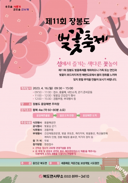 여명옥 면장은“코로나 이후 4년만에 개최되는‘장봉도 벚꽃축제’에 가족과 친구, 연인 등 많은 사람들이 참가해서 친목과 건강을 도모하는 경험을 하길 바라며 아름다운 섬 장봉도에서 즐거운 추억을 만들기 바란다”고 말했다.
