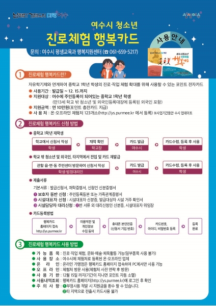 [금요저널] 여수시가 중학교 자유학기제와 연계해 ‘청소년 진로체험 행복카드’를 발급해 청소년의 진로설계를 적극 지원한다.