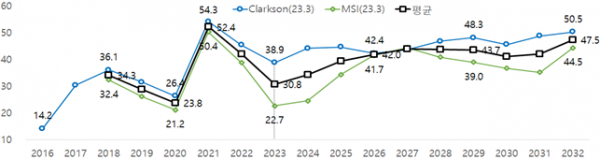 국제해사기구 환경규제 강화에 따른 친환경 선박의 수요증가 등에 기인해 글로벌 발주량은 ‘23년부터 증가해 ‘32년까지 연 3천만CGT 이상의 호조세를 유지할 전망이다.