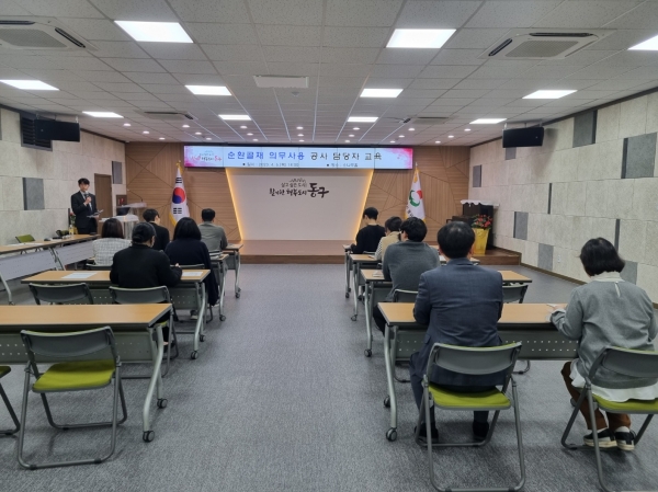 [금요저널] 인천 동구는 지난 6일 구 본청 공사발주 담당자를 대상으로 순환골재 의무사용 교육을 실시했다.