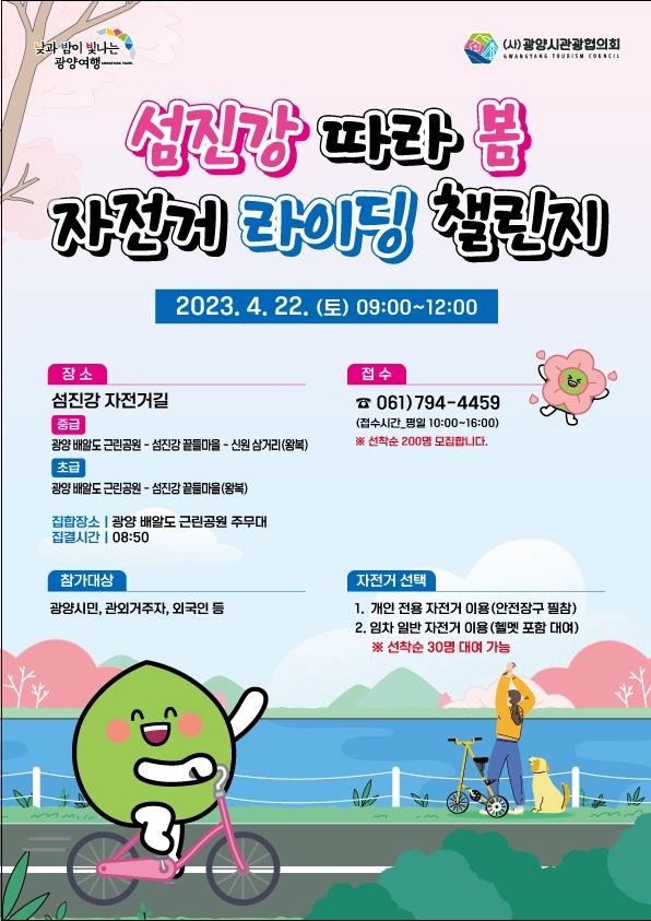 광양시가 광양시관광협의회 주관으로 오는 22일 오전 9시, 섬진강자전거길에서 ‘섬진강 따라 봄 자전거 라이딩 챌린지’를 추진한다고 밝혔다.
