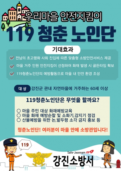 강진소방서 관계자는 “각 마을별 119청춘노인단이 조직되면 좀 더 안전한 마을 환경이 조성 될 수 있다”며 “이웃과 가족들의 안전을 위해 어르신들의 많은 가입을 부탁한다”고 말했다.
