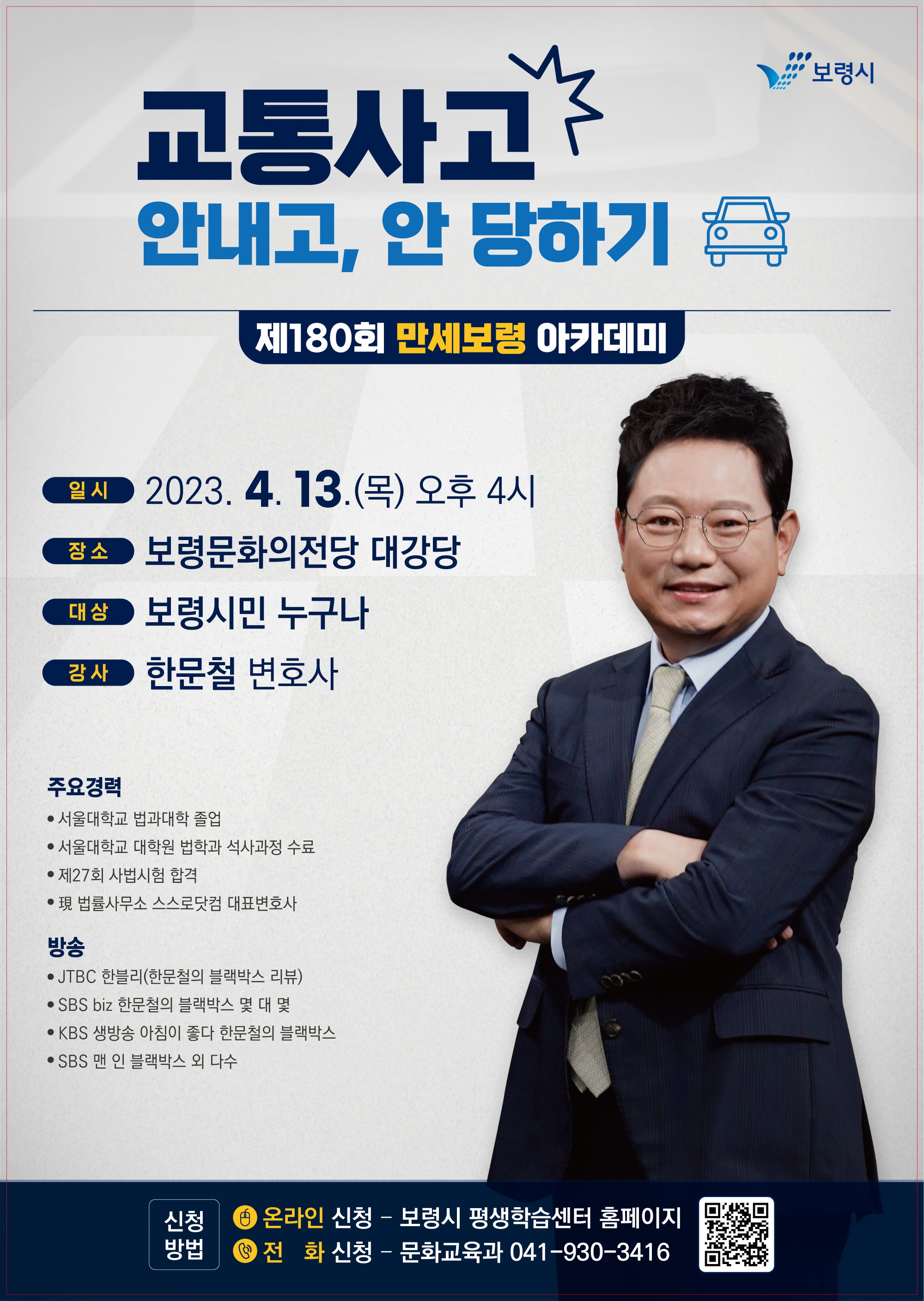 보령시는 오는 13일 오후 4시 보령문화의전당 대강당에서 한문철 변호사를 초빙해 ‘교통사고 안 내고, 안 당하기’라는 주제로 제180회 만세보령 아카데미 강연을 개최한다.