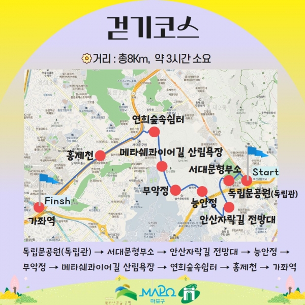 걷기 코스는 총 8km 거리로 독립문공원에서 출발해 안산자락길, 홍제천을 지나 가좌역까지 이어진다.
