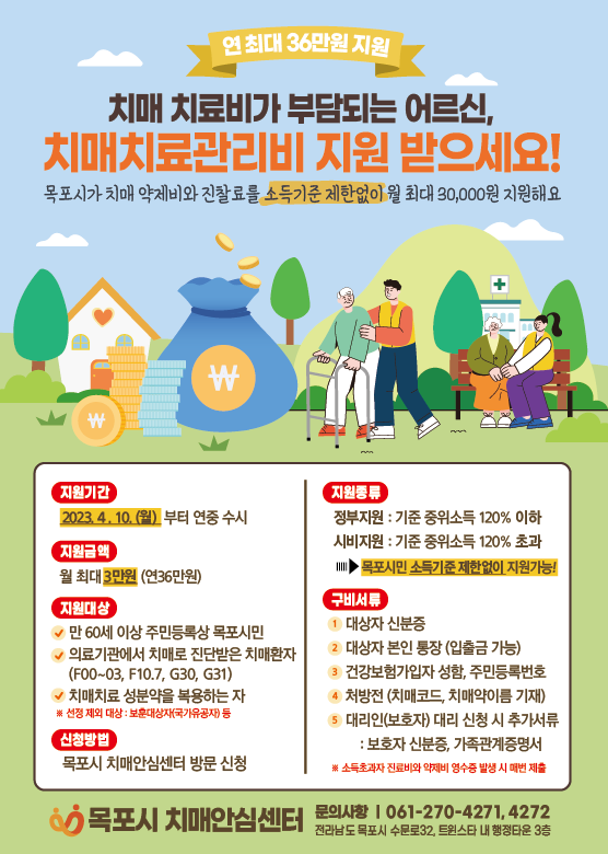 지원내용은 신청일 기준 주민등록상 목포시에 거주하며 치매안심센터에 등록된 치매환자로 치매약 처방 당일 진찰료와 치매 약제비의 본인부담금으로 최대 월 3만원, 연간 36만원까지 지원 받을 수 있으며신청방법은 치매 진단 질병코드 및 치매 치료 약제명이 기재된 처방전 등 구비서류를 갖춰 치매안심센터를 방문해 신청하면 된다.